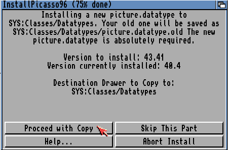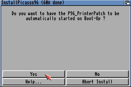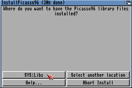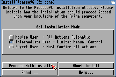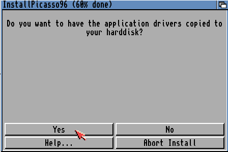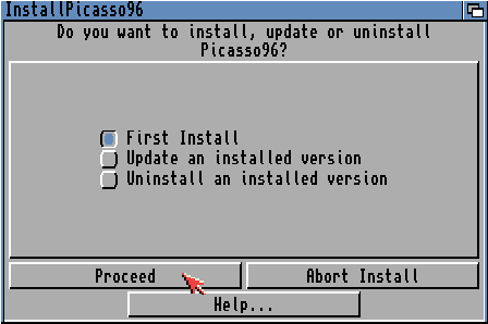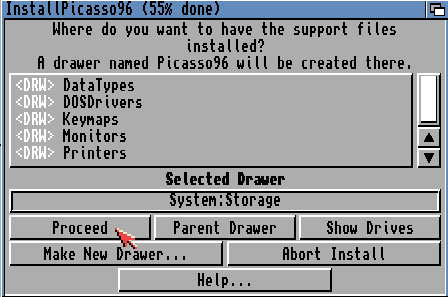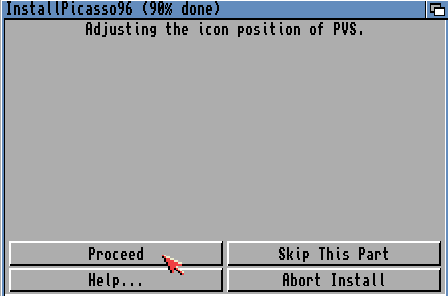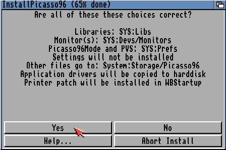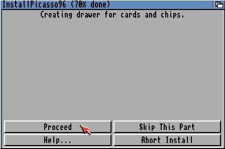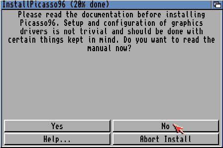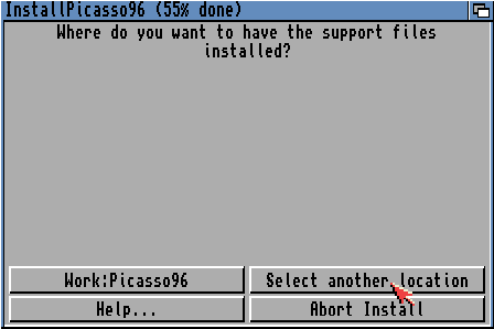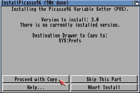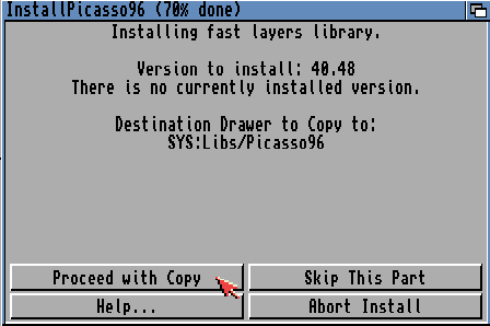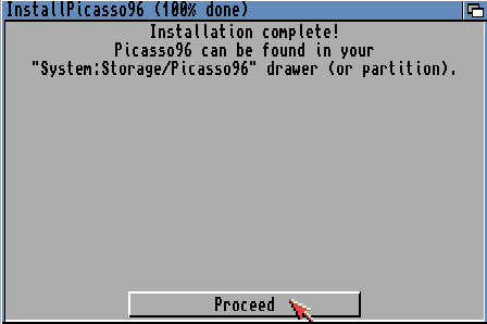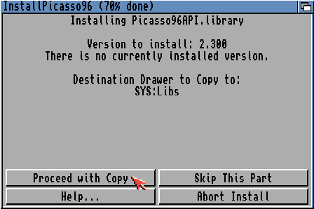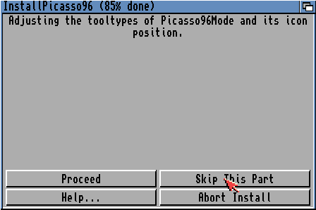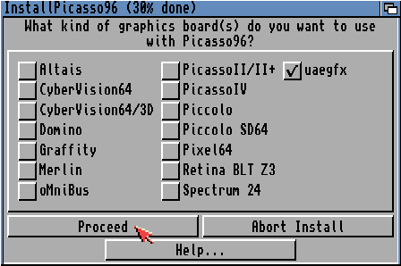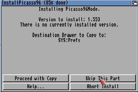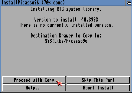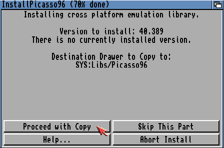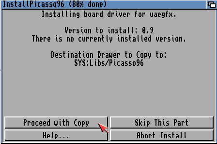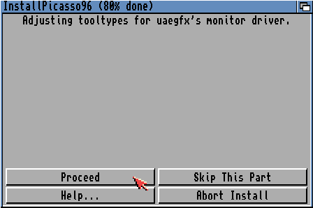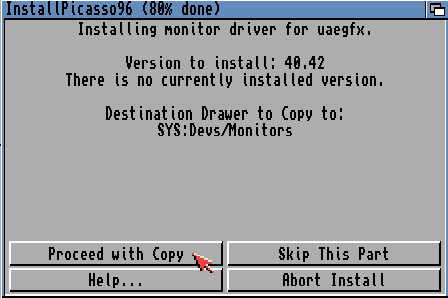 Installation starten:![]() ![]() ![]() ![]() ![]() Hier ist wichtig, dass wir uaegfx angewählt haben.![]() ![]() ![]() ![]() ![]() Wir wählen "Select another location" aus.![]() Für die Support Files wählen wir DH0:System:Storage aus.![]() ![]() ![]() ![]() ![]() ![]() ![]() ![]() ![]() ![]() ![]() ![]() ![]() Picasso96Mode brauchen wir in der Amiga Emulation nicht. Also "Skip This Part".![]() Tooltypes für Picasso96Mode brauchen wir auch nicht. Also "Skip This Part".![]() ![]() ![]() ![]() Jetzt muss der Amiga rebootet werden!![]()